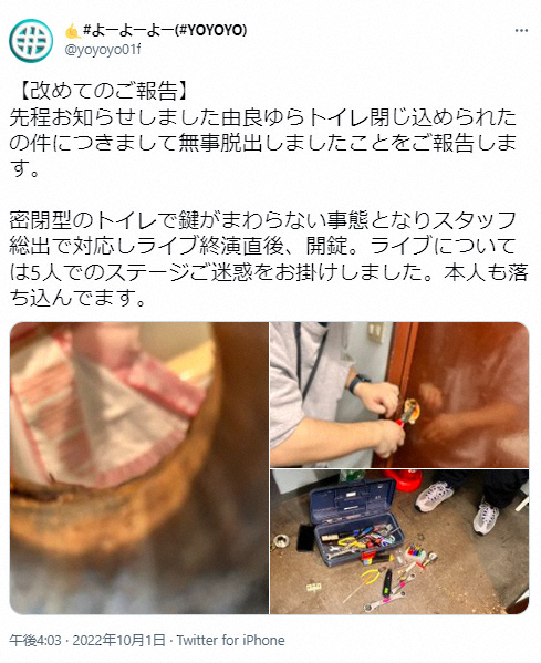 午後4時すぎ、「先程お知らせしました由良ゆらトイレ閉じ込められたの件につきまして無事脱出しましたことをご報告します。密閉型のトイレで鍵がまわらない事態となりスタッフ総出で対応しライブ終演直後、開錠。ライブについては5人でのステージご迷惑をお掛けしました。本人も落ち込んでます」と状況を説明。工具でトイレのカギをまるごと解体して扉を開けた様子の画像を投稿した。