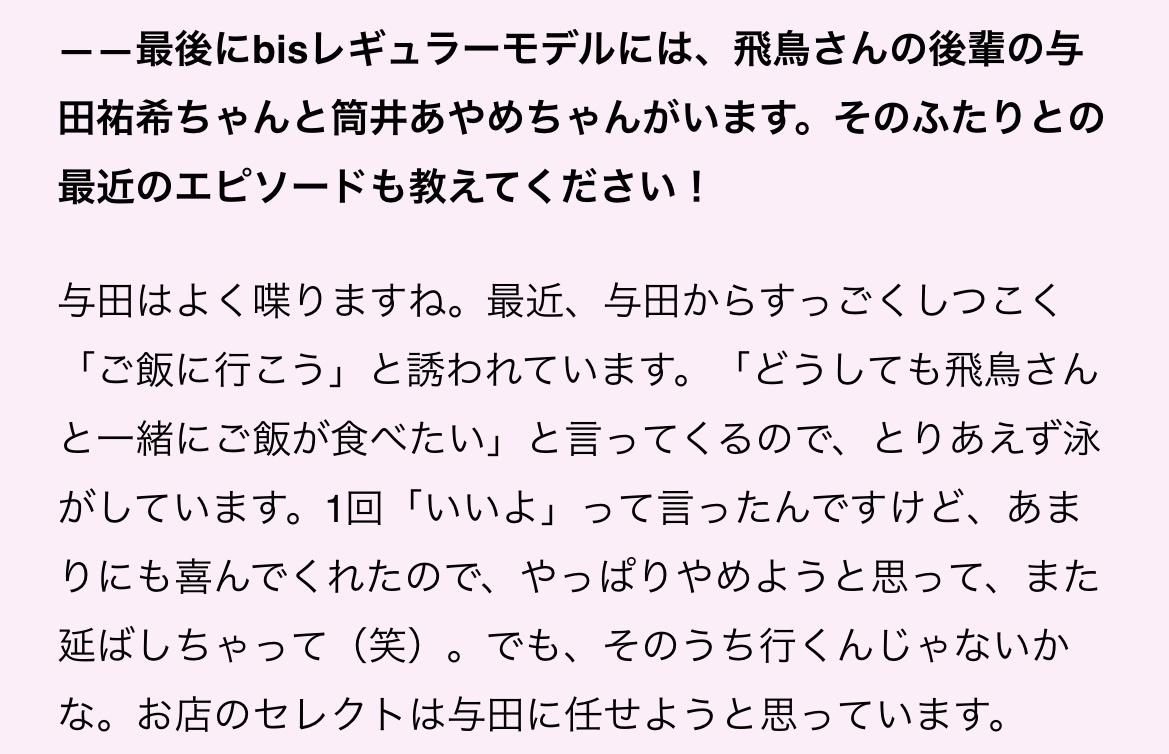 最近、与田からすっごくしつこく「ご飯に行こう」と誘われています。「どうしても飛鳥さんと一緒にご飯が食べたい」と言ってくるので、とりあえず泳がしています。1回「いいよ」って言ったんですけど、あまりにも喜んでくれたので、やっぱりやめようと思って、また延ばしちゃって(笑)。でも、そのうち行くんじゃないかな。お店のセレクトは与田に任せようと思っています。