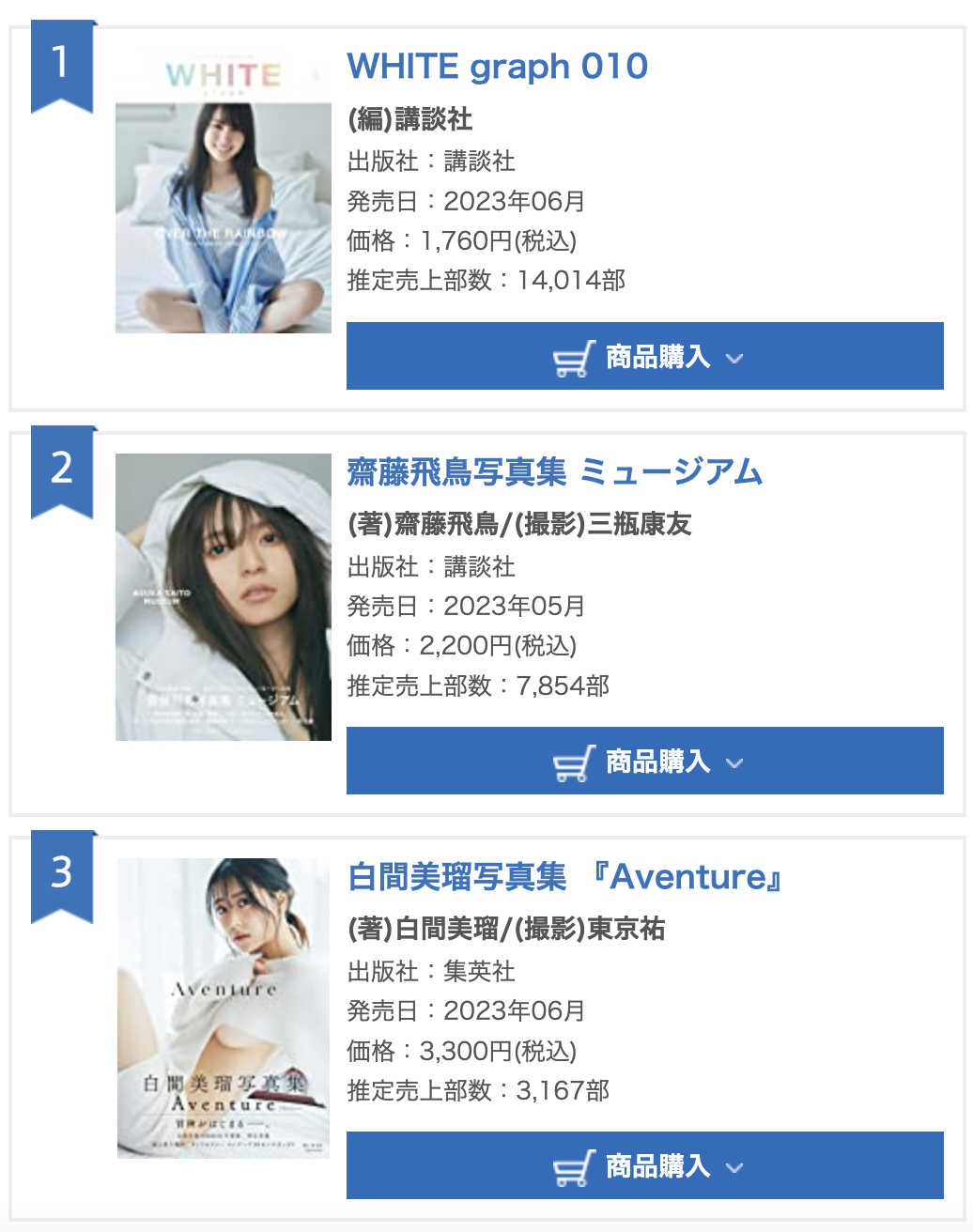 【乃木坂46】賀喜遥香 表紙「WHITE graph 010」がオリコン写真集ランキングで1位に!売上部数は… 2023/6/17 乃木坂46まとめの「ま」 " " 520: 君の名は(光) 2023/06/16(金) 11:16:23.53 かっきーWHITE Graph オリコン 1位 14014部https://www.oricon.co.jp/rank/obp/w/2023-06-19/ 続きを読む Source: 乃木坂46まとめの「ま」