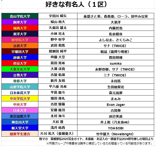 #箱根駅伝 #箱根駅伝2025 走者が確定するのは明日からだが、 OGを含めると、好きな有名人に坂道メンバーを書いているエントリー選手は、 乃木坂が9人、欅坂・櫻坂が6人、日向坂が5人だった。
