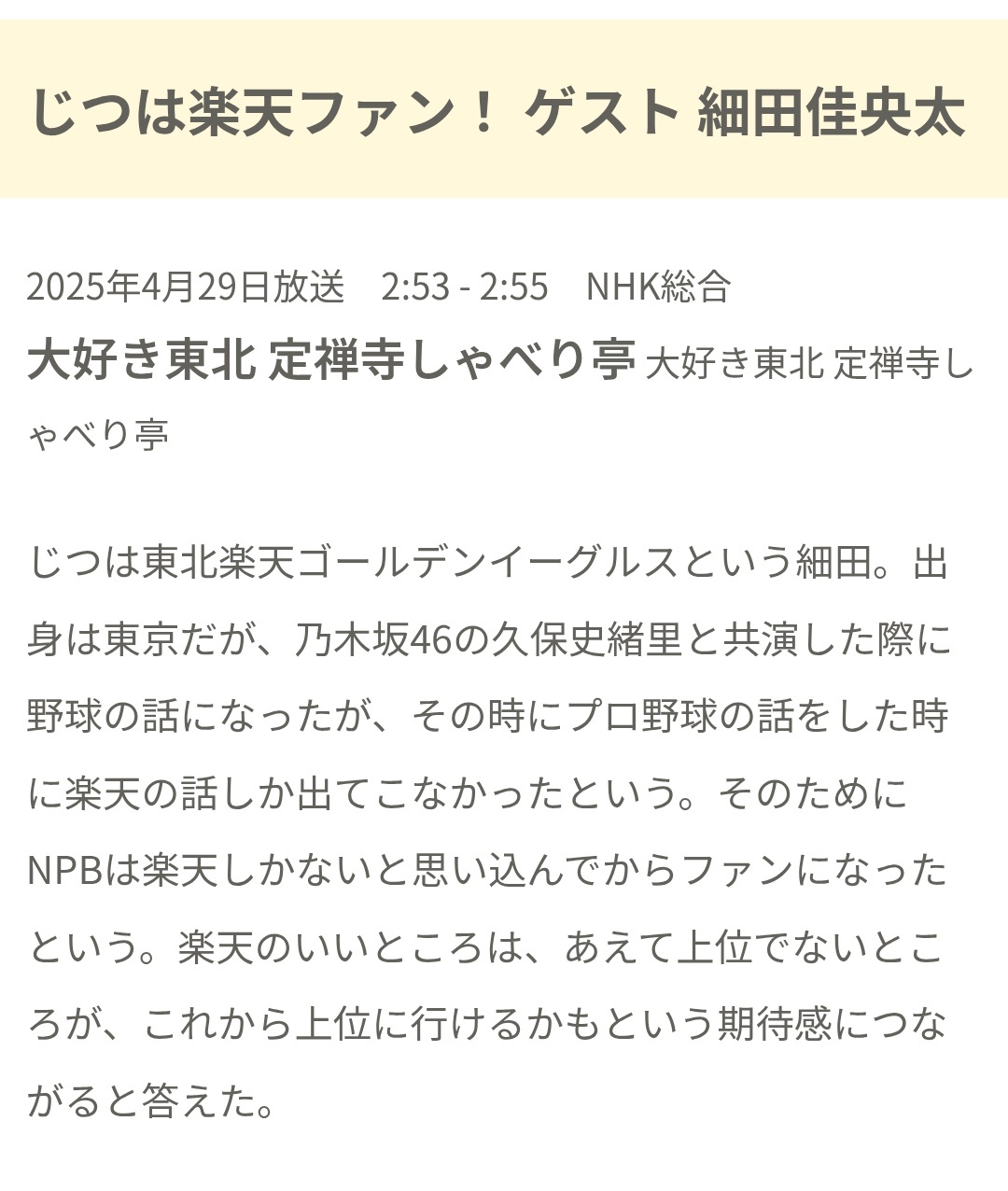 大河ドラマで共演した #久保史緒里 さんの布教で楽天イーグルスファンになったという細田さん🙌