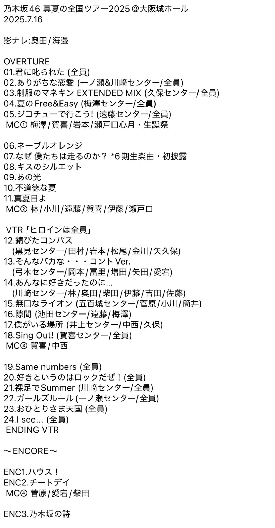 乃木坂46 #真夏の全国ツアー2025 大阪Day1 セットリスト!6期生楽曲「なぜ 僕たちは走るのか?」初披露!瀬戸口心月センター!瀬戸口の20歳の誕生日当日に自身のセンター楽曲初披露!錆びたコンパスはセンター変更!アンコール関西メンバーがタコになり登場! #nogizaka46 #乃木坂全国ツアー大阪Day1 pic.twitter.com/Pf8J9faOHd
