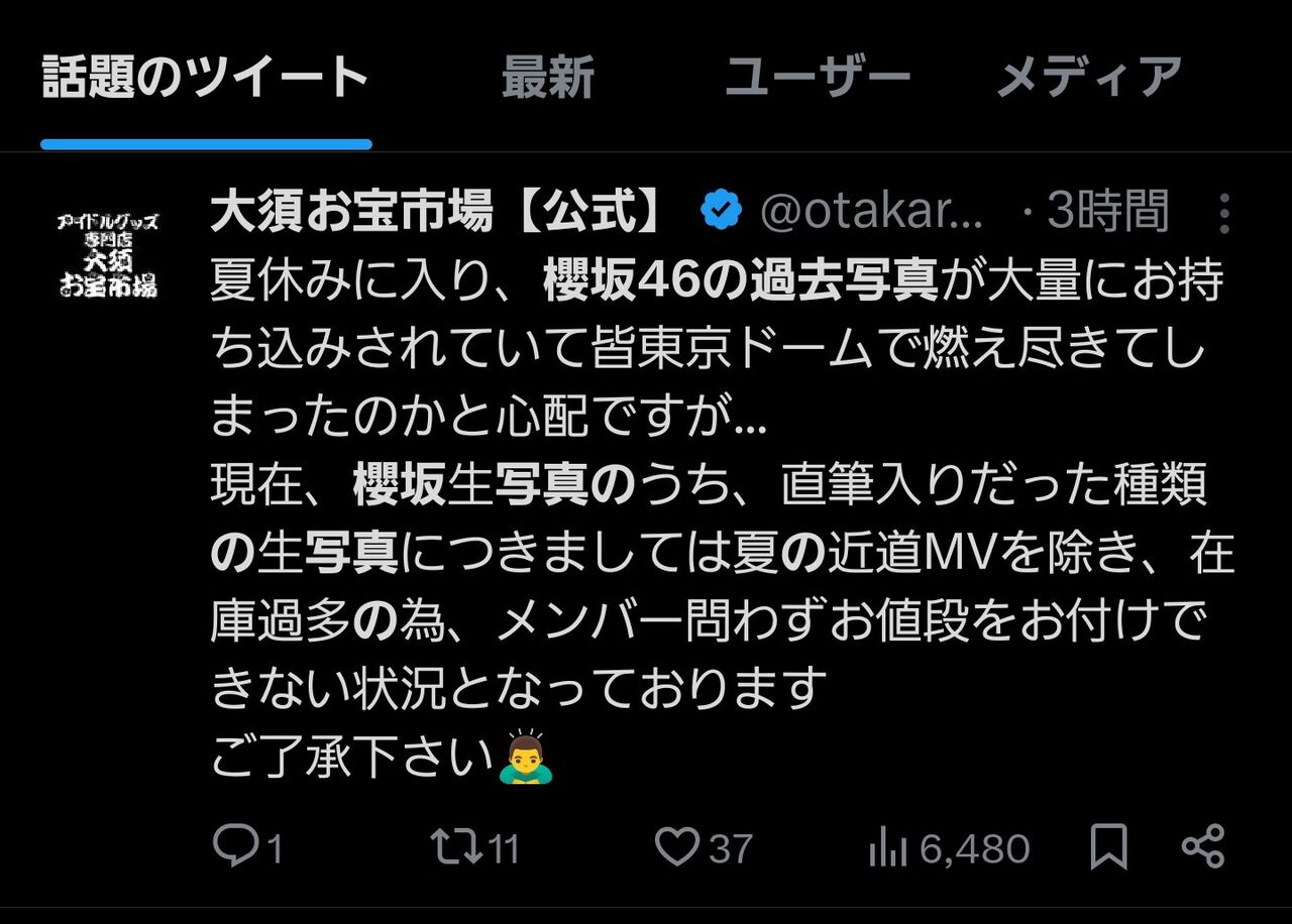 アイドルショップ『櫻坂46生写真は在庫過多』『値段つけられない』 2025/9/1 乃木坂46まとめ 乃木りんく " " 1: 名無し46 2025/08/31(日) 16:34:26.64 ID:2P7Dm 続きを読む Source: 乃木坂46まとめ 乃木りんく