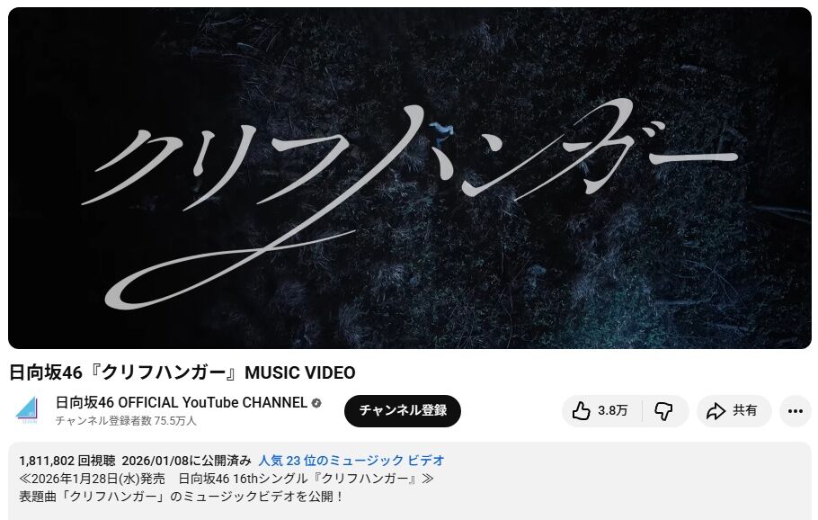 【悲報】アンハピ構文の再生回数、クリフハンガーに抜かれた模様 2026/1/22 乃木坂46まとめ 乃木りんく " " 1: 名無し46 2026/01/21(水) 23:13:22.29 ID:v8L8q 『Unhappy birthday構文』 14日間の再生回数 1,811,141 回 「クリフハンガー」 13日間+23時間の再生回数 1,811,802 回 続きを読む Source: 乃木坂46まとめ 乃木りんく