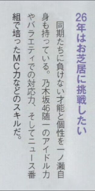 一ノ瀬美空「今年はお芝居に挑戦したい」 2026/1/24 乃木坂46まとめ 乃木りんく " " 1: 名無し46 2026/01/21(水) 17:10:34.92 ID:BGr0P ちなみに池田も言ってる 続きを読む Source: 乃木坂46まとめ 乃木りんく